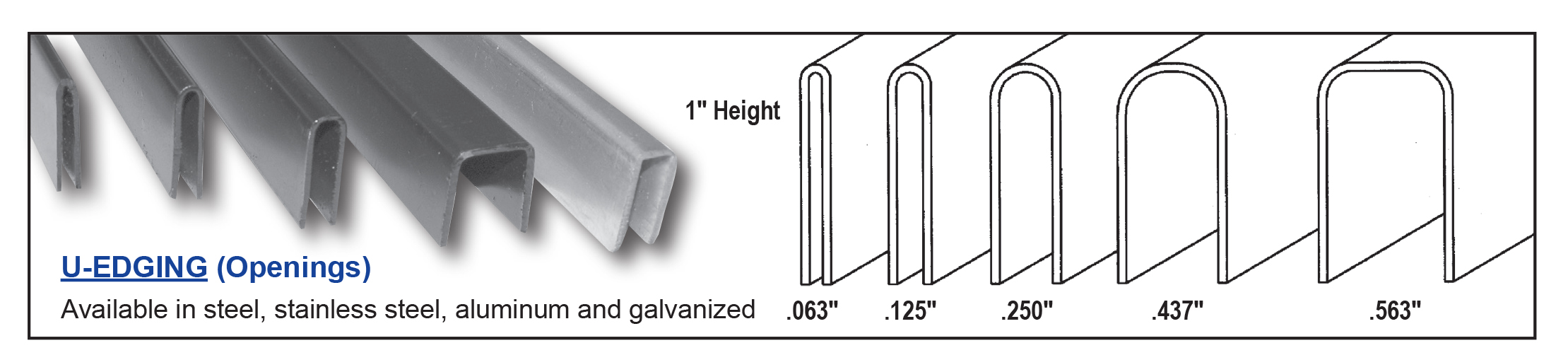 Expanded metal U-Edging is an expanded metal product accessory. It is a metal u-shaped strip attached to the edge of an expanded metal product to make the edges more attractive and uniform. It provides a safety barrier at the cut edge of the sheet covering sharp cut edges. U-Edging is easy to install and long lasting. It is available in carbon steel, stainless steel, aluminum and galvanized steel.
