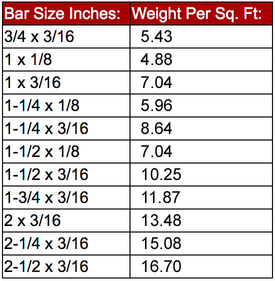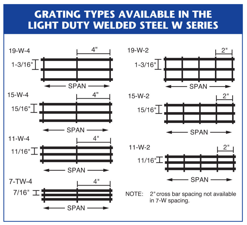 - Light Duty steel grating ranges in size from 3/4" x 3/16" to 2-1/2" x 3/16"