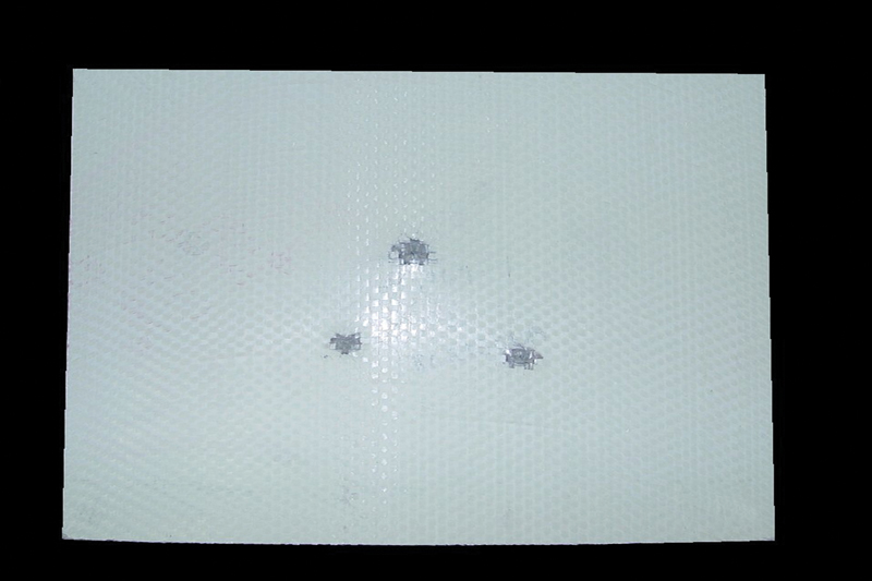 Our bullet resistant fiberglass panels are constructed from layers of 0-90-degree woven E-glass fiber reinforcements with a proprietary resin system in several sizes from 36 by 84 inches to 48 by 120 inches with other panel lengths available. These bullet resistant fiberglass panels are rated for Listing by Underwriters Laboratory for Ballistic Resistance to UL 752, authorizing Direct Metals® use of UL’s Mark. Direct Metals® bullet resistant fiberglass panels are fire rated for 1 hour per ASTM E-119-09c Fire Tests of Building Construction and Materials, modified to a smaller scale gypsum board wall assembly. Panels also meet a flame spread rating of 45 and a smoke developed rating of 165 per ASTM E-84-08a Standard Test Method for Surface Burning Characteristics of Building Materials, achieving a NFPA and IBC Class B fire rating. Class A panels are also available in production quantities.