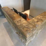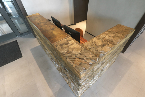Direct Metals® supplied brass lockcrimp cage wire mesh to a customer for creating a stunning Gabion Reception Desk. The desk is comprised of eight unique brass cages of four distinct mesh openings filled with reclaimed rocks from the Brooklyn, NY area, and is a welcoming feature at a high-end residential building along Brooklyn Bridge Park. The desk covers 12 sq. ft. and stands 3 ft. 8 in. high with an approximate weight of 4,000-5,000 lbs.