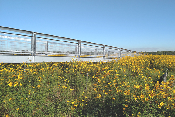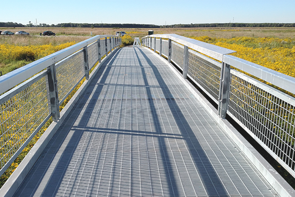Direct Metals® supplied 56 pieces of 2-1/2" x 3/16" 7P4 Press Locked galvanized steel grating as part of the site improvement plans for Tinley Creek Forest Preserve in Cook County, IL—just outside of Chicago. Counter sunk lands were used to mechanically fasten down the grating. The galvanized metal grating is meets ADA requirements and is being used as steel flooring for the pedestrian bridge located in the Killdeer Wetlands.