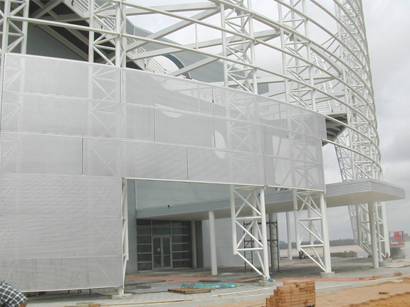 Direct Metals® supplied a custom aluminum perforated metal job for Tunica RiverPark & Museum in Tunica, Mississippi. The .125" thick aluminum perforated metal was supplied in three different perforation patterns to give depth and artistic flair to the front façade of the river park building. One-third of the job had a 3/4" diameter hole, the second-third had a 1" diameter hole and the remaining perforated metal was supplied with a 1-1/4" diameter hole. The aluminum perforated metal was fastened to a curved galvanized steel tubing frame to create this custom masterpiece!